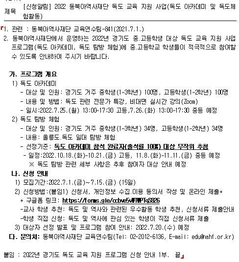 2022 µ¿ºÏ¾Æ¿ª»çÀç´Ü µ¶µµ ±³À° Áö¿ø »ç¾÷(µ¶µµ ¾ÆÄ«µ¥¹Ì ¹× µ¶µµÃ¼ÇèȰµ¿)