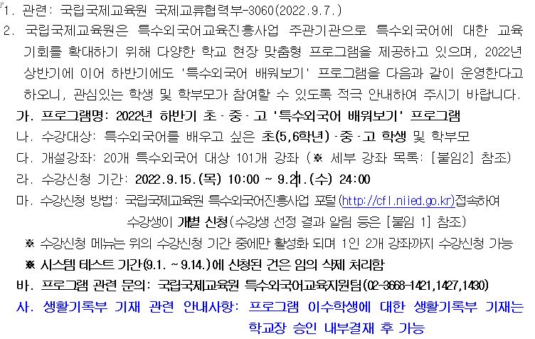 2022³â ÇϹݱâ ÃÊ¡¤Áß¡¤°í 'Ư¼ö¿Ü±¹¾î ¹è¿öº¸±â' ÇÁ·Î±×·¥ ¼ö°­½Åû ¾È³»