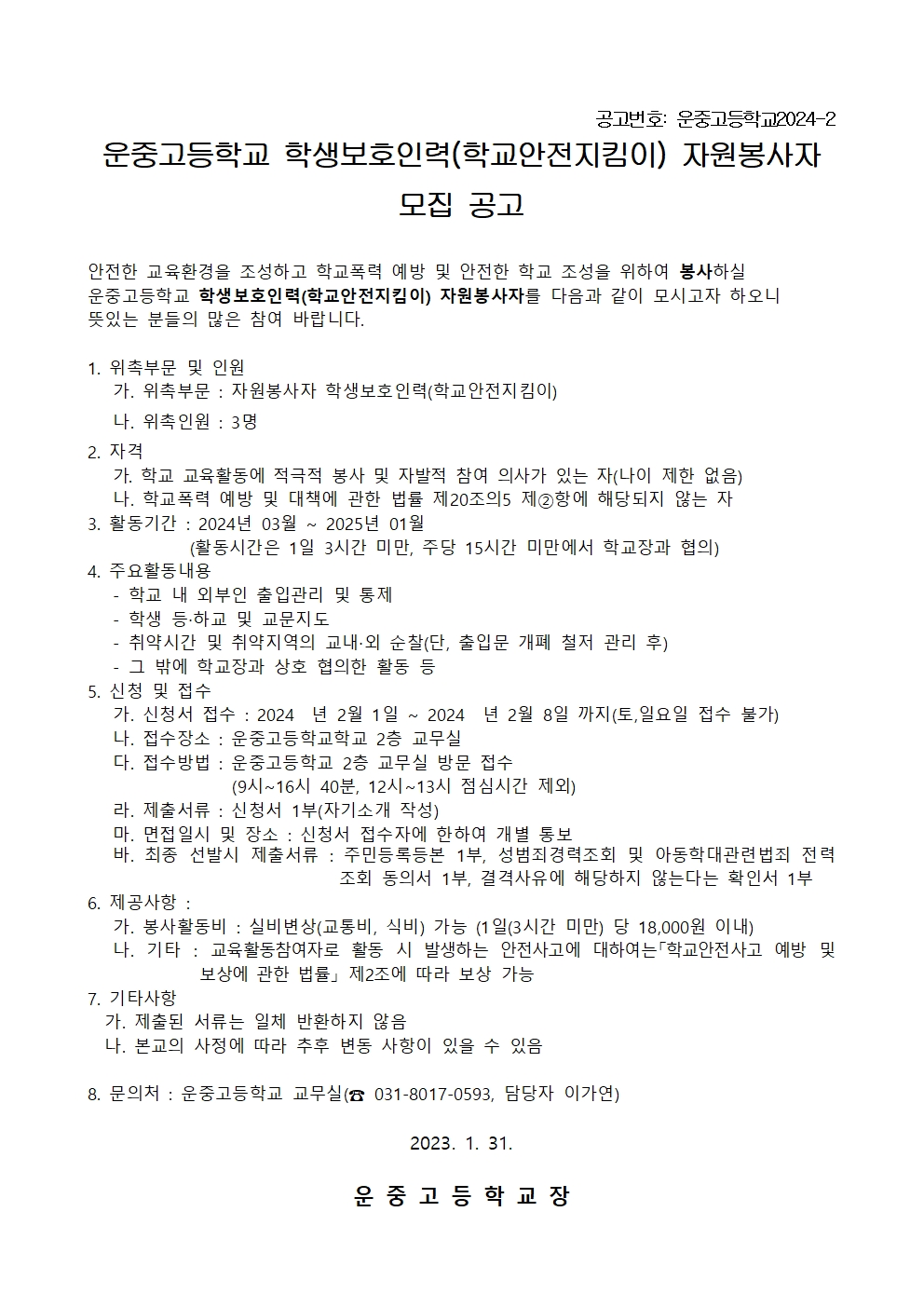 ¿îÁß°íµîÇб³ Çлýº¸È£ÀηÂ(Çб³¾ÈÀüÁöÅ´ÀÌ) ÀÚ¿øºÀ»çÀÚ ¸ðÁý °ø°í