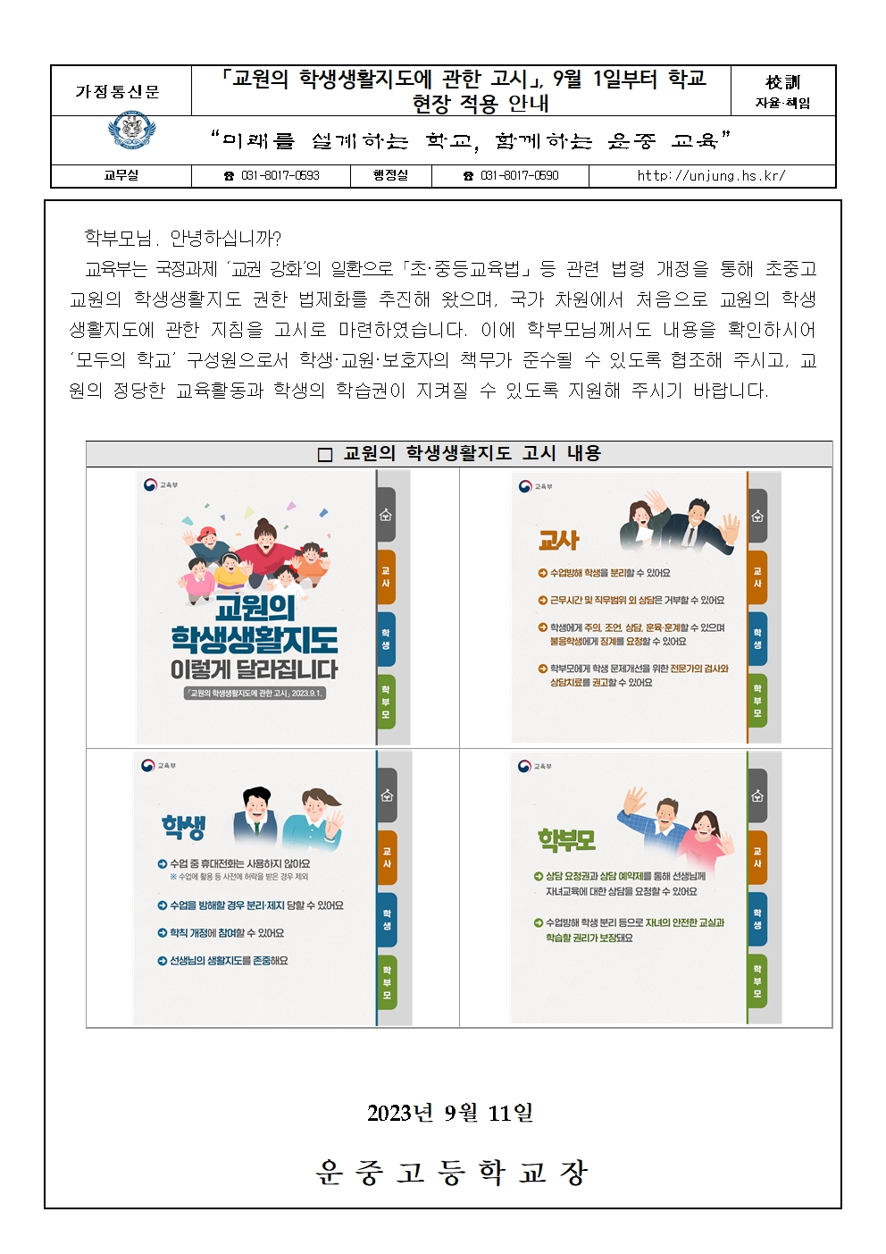 ¡¸±³¿øÀÇ Çлý»ýȰÁöµµ¿¡ °üÇÑ °í½Ã¡¹, 9¿ù 1ÀϺÎÅÍ Çб³ ÇöÀå Àû¿ë ¾È³»