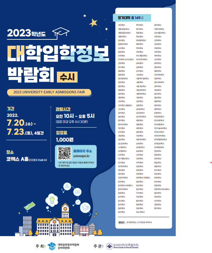 Çѱ¹´ëÇб³À°ÇùÀÇȸ¿¡¼­´Â ¼öÇè»ýÀÇ ´ëÀÔÁغñ¿¡ µµ¿òÀ» ÁÖ°íÀÚ Àü±¹ 149°³ ´ëÇÐÀÌ Âü°¡ÇÏ´Â <2023Çг⵵ ¼ö½Ã ´ëÇÐÀÔÇÐÁ¤º¸¹Ú¶÷ȸ>¸¦ °³ÃÖÇÏ¿À´Ï, À¯¿ëÇÑ ´ëÀÔÁ¤º¸¸¦ Á¦°ø¹ÞÀ» ¼ö ÀÖµµ·Ï Çлý, Çкθð´Ô²²¼± ¸¹Àº Âü°í ¹Ù¶ø´Ï´Ù.