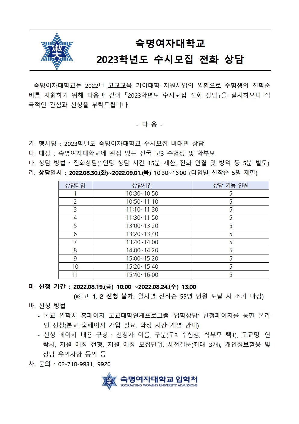 ¼÷¸í¿©ÀÚ´ëÇб³ 2023Çг⵵ ¼ö½Ã¸ðÁý ÀüÈ­ »ó´ã