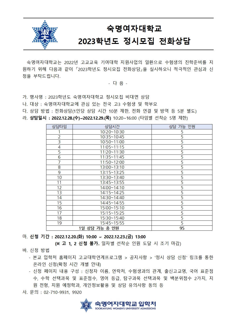 ¼÷¸í¿©ÀÚ´ëÇб³ 2023Çг⵵ Á¤½Ã¸ðÁý ÀüÈ­»ó´ã ¾È³»